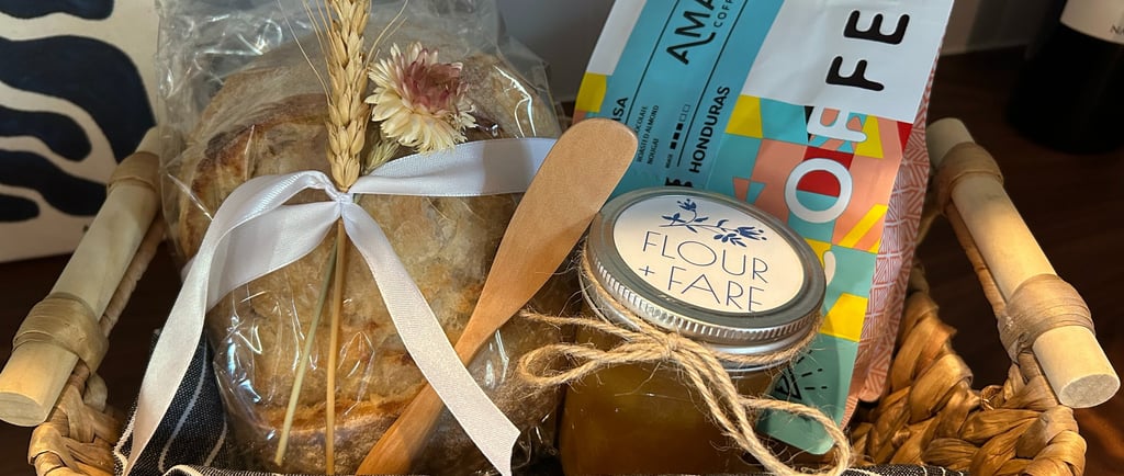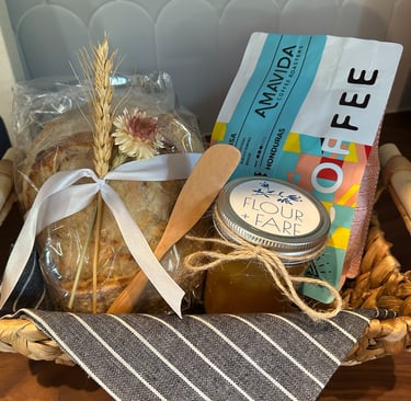 Perfect gift for new parents or anyone that loves toast and coffee in the morning. This thoughtful basket includes a baby organic boule, organic jam, local coffee and a sweet bamboo butter spreader.